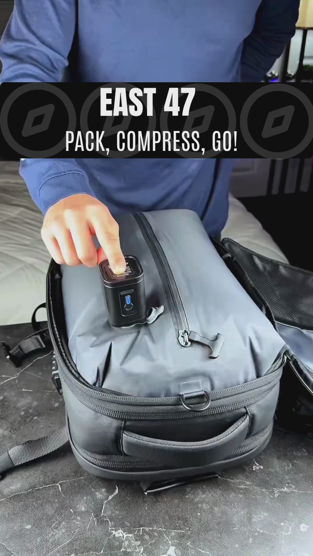 A backpack that packs like a suitcase, without looking like one. With built-in vacuum compression, a compact electric mini pump included, moisture-proof materials, and a zero-nonsense design, EAST 47 helps you go further with less.